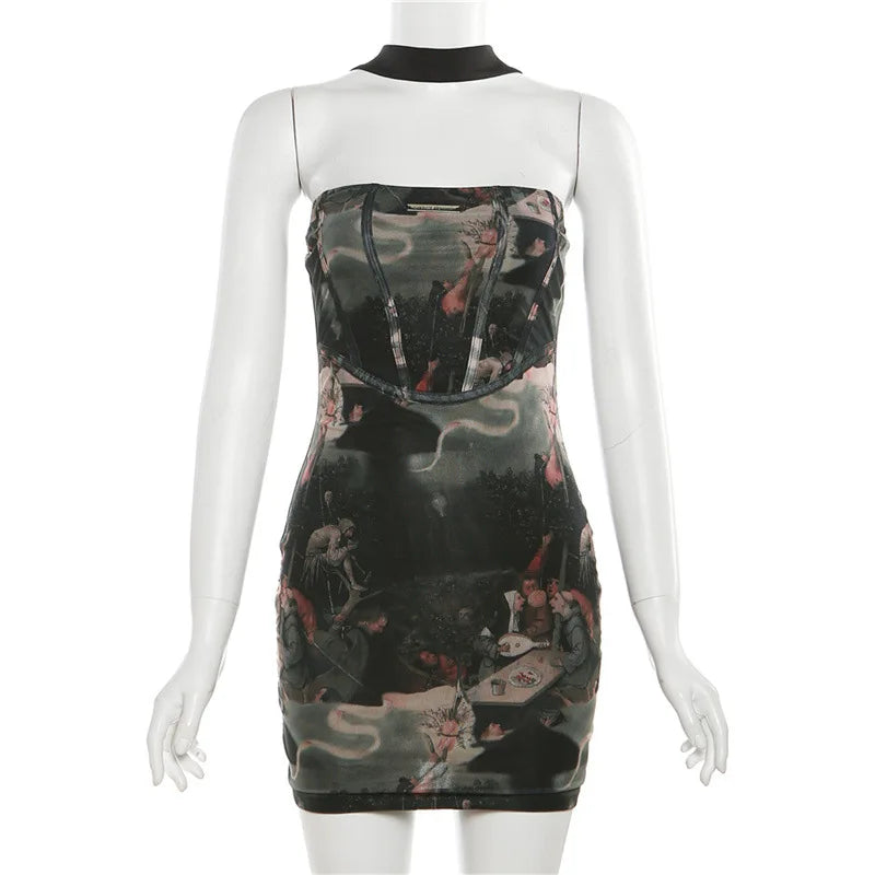 DERSONA 2025 Rave Outfit Printed Mini Dress For Women Hipster Patchwork Pattern Short Midnight Partywear Night Club